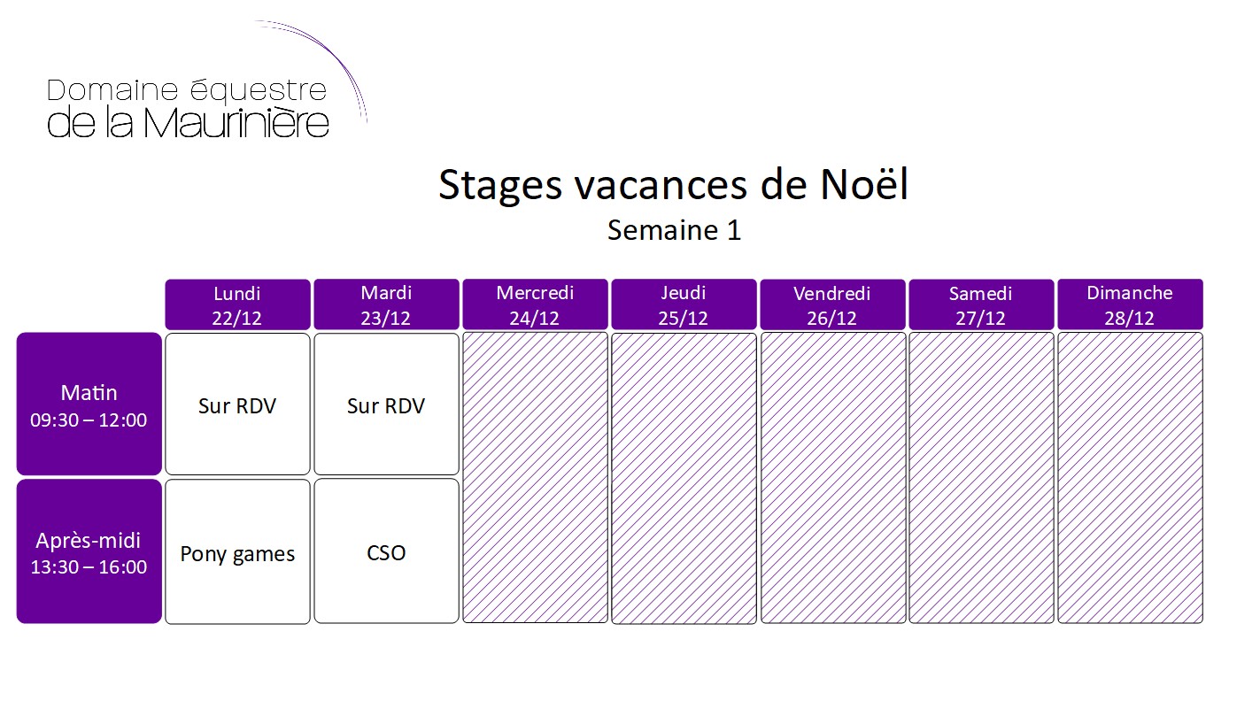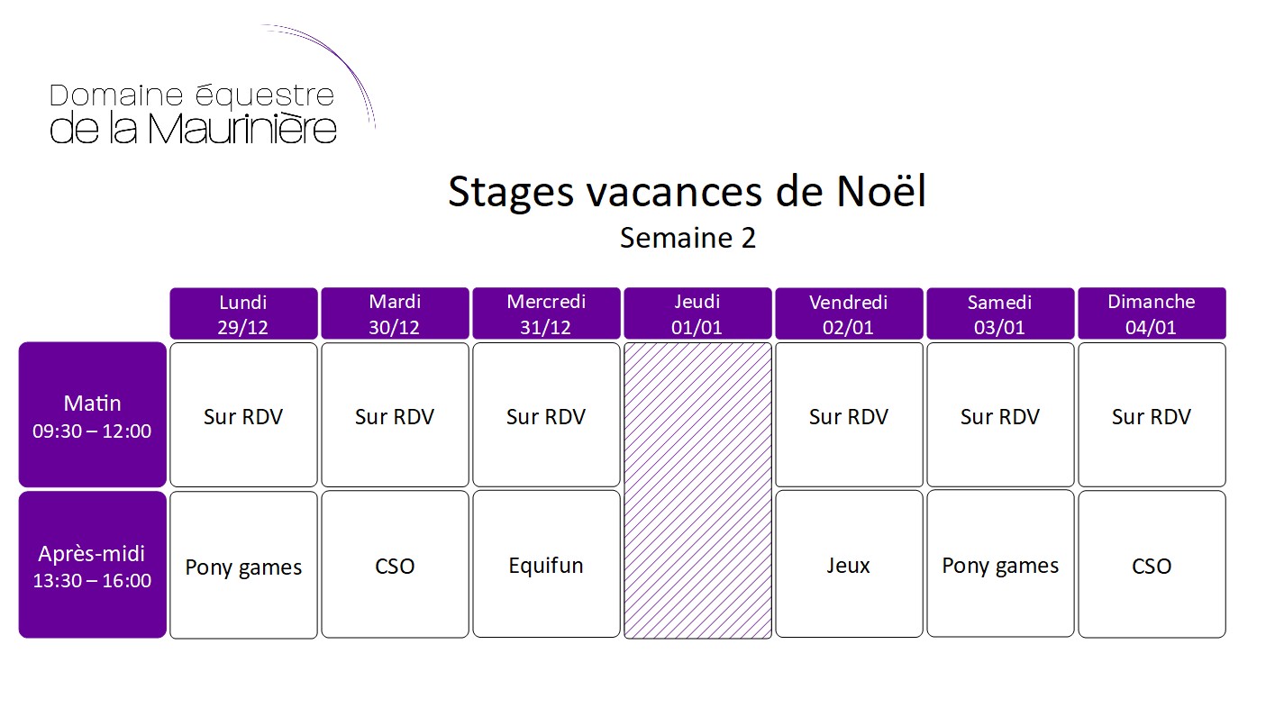 Le Domaine de la Maurinière vous donne rendez-vous lors des vacances scolaires pour (re)découvrir diverses disciplines, prendre le temps de progresser (ou vous perfectionner !) ou tout simplement pour passer des moments agréables et conviaux avec les chevaux et entre passionné(e)s. Les stages sont aussi l’occasion de passer vos Galops FFE ! Les activités sont maintenues quel que soit la météo grâce au manège couvert !
